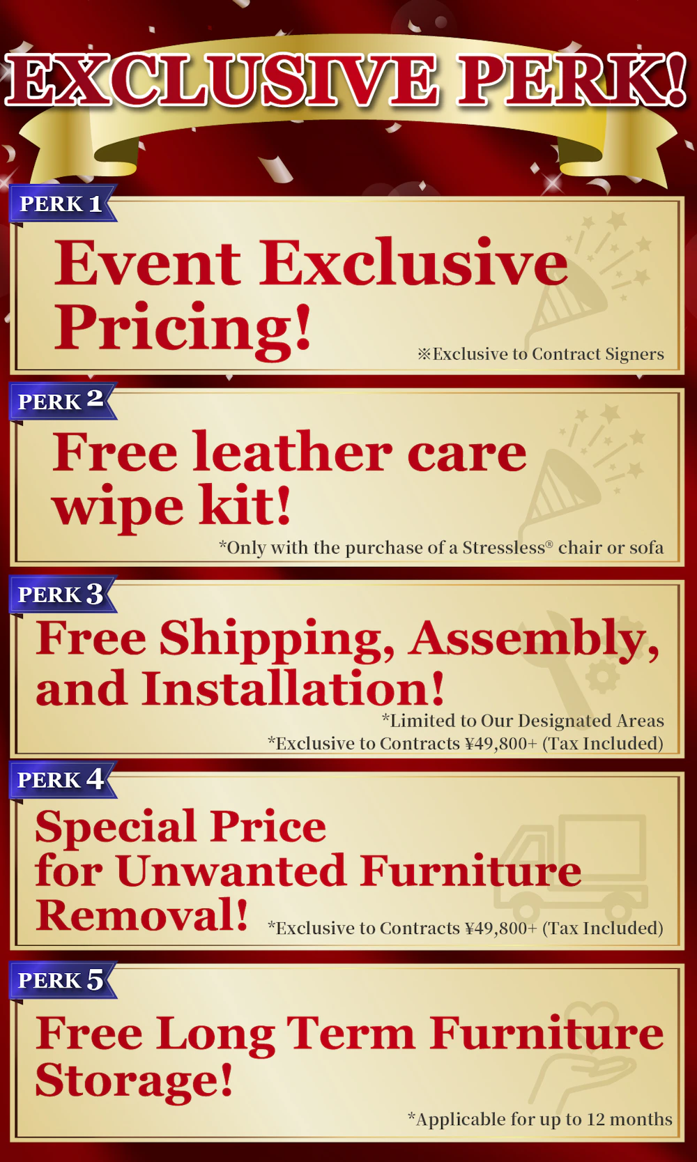 お買上げ商品1点毎の同等品に限り、不要家具を特別価格にて処分します。